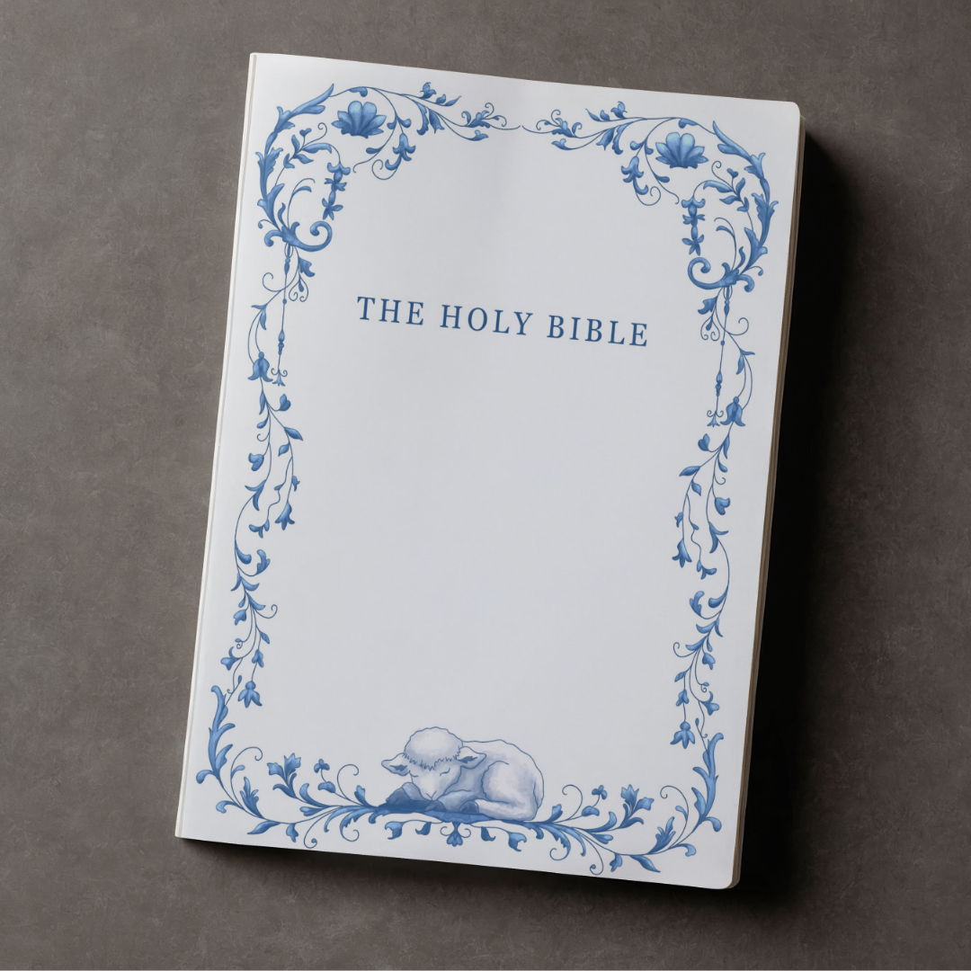 This design emphasizes timeless reverence through a restrained blue-and-white palette, delicate symmetry, and intentional restraint. Inspired by heirloom decorative arts, the filigree border frames the cover with quiet elegance while guiding the eye inward. A sleeping lamb, seamlessly integrated into the ornament, serves as a gentle symbolic anchor representing peace and the Lamb of God. Generous white space and classic serif typography complete the composition, creating a refined, heirloom-quality Bible cover that feels calm, balanced, and enduring.